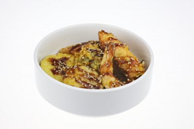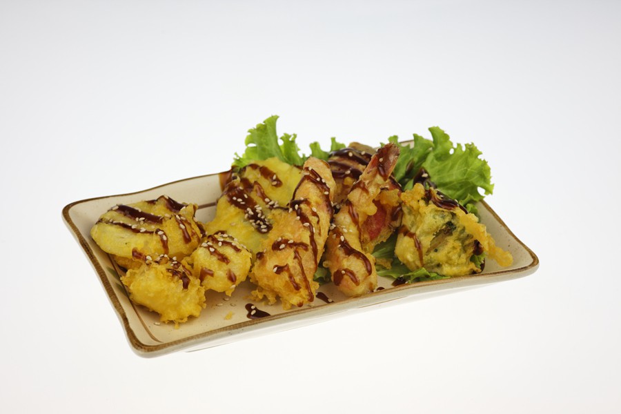 рис,нори,тигровая креветка в темпуре,лосось,цукини,сладкий перец,лук,соус унаги
